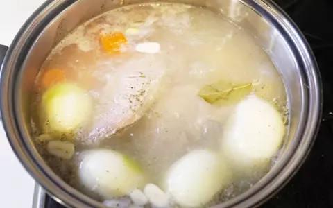 4.一度沸騰させて灰汁を丁寧に取った後、お好みのハーブを加えます。