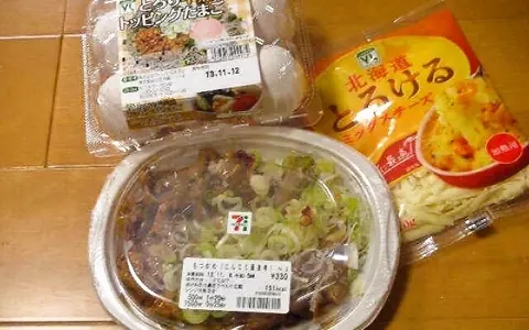 その目についたお惣菜はセブンイレブンで販売している「もつ炒め」! それ以外に用意したのはとろけるチーズと半熟玉子。では早速作っていこう。
