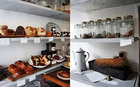 白い店内は1階にキッチンがあり、テイクアウトもできる自家製の天然酵母のパン、季節のジャム、フルーツタルトやピクルスなどが並んでいます。