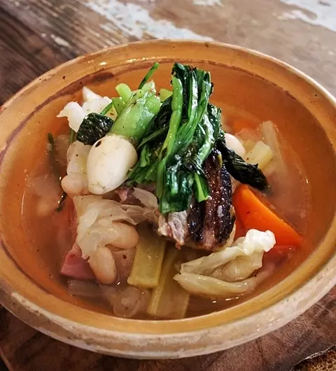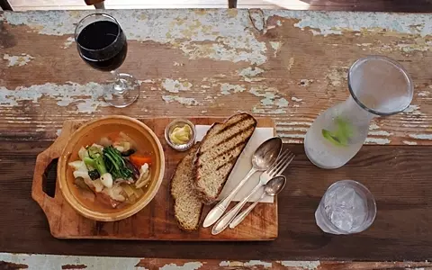 洋雑誌の中のテーブルのようなスープセット。選んだ飲み物は赤ワイン。スープの具にはグリルした塩豚、白インゲン、人参、キャベツ、セロリ、ベーコン、かぶ。野菜の旨みがたっぷり出たスープはしみじみしたおいしさです。