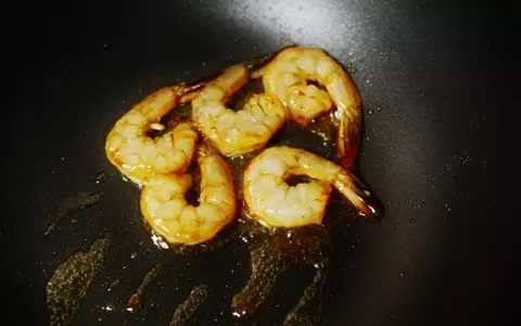 2.翌朝、フライパンにごま油を少々熱し、1の海老の汁気を切って入れて両面返しながら焼く。