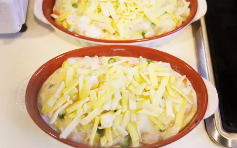 7. 行程5のホワイトソースを注ぎ、上にチーズをのせます。