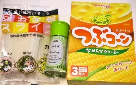 用意したのはインスタントのコーンスープとスライス餅、パセリの3品。どれもスーパーやコンビニなどで買うことができる商品だ。保存もきくので、揃えておくと一人暮らしさんの急な発熱時の強い味方になってくれそう。