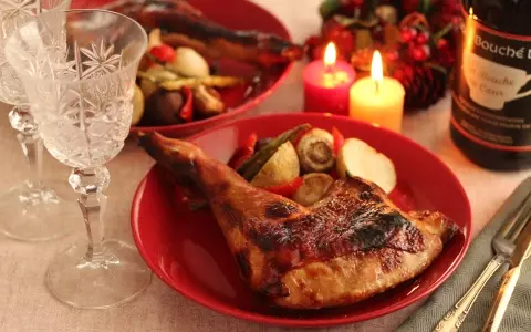丸鶏はちょっとハードルが高いので、今回は骨付きの鶏もも肉で作ります。クリスマスらしい華やかな雰囲気に仕上げましょう。もちろん、手軽な骨なしの鶏もも肉でもOKです!