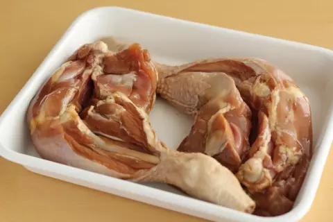 骨付き鶏もも肉は下処理が済んだ状態で売られていることも多いですが、下処理前のものを購入した場合は、このように裏面の骨に沿って包丁で切り込みを入れて開き、関節の部分を切ってください。