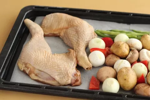 3)天板にオーブンシートを敷き、1)の鶏肉を皮が上になるようにおく。あいたスペースに2)の野菜を並べ、塩・胡椒、オリーブオイルをかける。