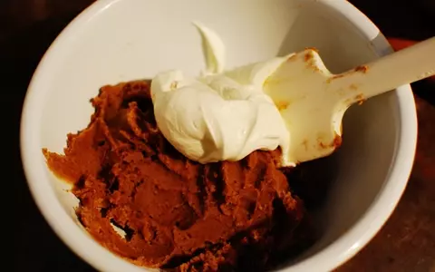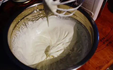 4. 3の生クリームの1/4量を2と合わせ、ゴムへらで混ぜあわせる。絞り袋に入れる。