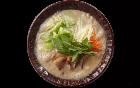 昆布と鰹の合わせだしにはじめから白味噌を入れたところに、なべの具は茹でキャベツ、茹でジャガイモ(千切り)、茹でニンジン、せり、焼いた豚バラ肉を使用。白味噌は早く煮詰まるので、具に火を通しておくのがポイントです。シチューのようになり、炊くほどにうま味も増すので、ごはんやラーメンなどとも相性が良く、〆も楽しみな一品。