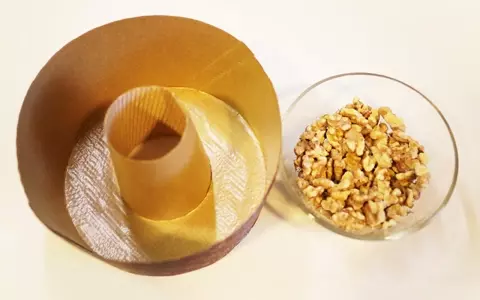 紙製以外の型を使う場合は取り出しやすくするため、分量外のバターを内側に薄く塗ります。さらに茶こしに分量外の小麦粉を入れて振りかけ、余分な粉を落としておきます。クッキングシートを内側に敷き込んでもOK。クルミはフライパンに入れて、弱火でかるく炒っておきます。