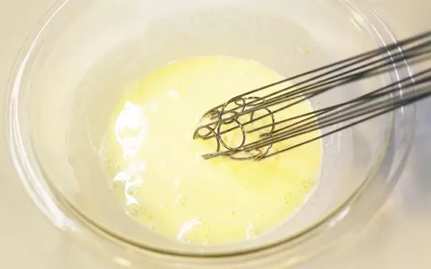 4.ボールに卵と砂糖を入れて泡だて器でよく混ぜます。よく混ざったら生クリームも加えてよく混ぜます。