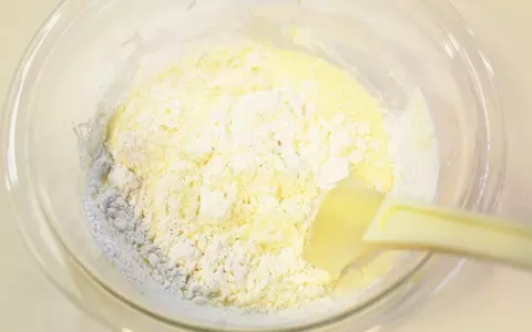 5.オーブンを160℃に予熱開始します。ホットケーキミックスを2~3回にわけて加えつつ、ゴムベラで切るように混ぜます。