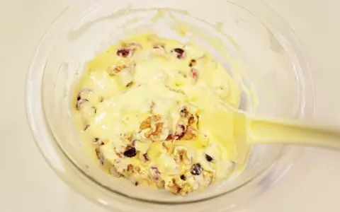 7.粉っぽさが少し残る程度のところで、ドライフルーツとクルミを加えて混ぜます。