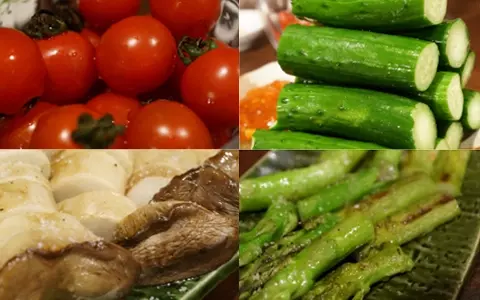 プチトマトときゅうり、アスパラとエリンギなど、野菜類も新鮮でみずみずしく味が濃い。