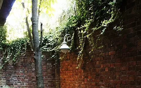 店の奥の緑に囲まれたレンガ敷きの明るいテラス席は、犬連れも利用することができます。