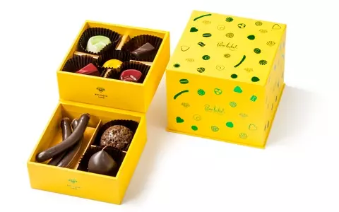 本命チョコにオススメなのが、シャトーボックスシリーズの「シャトーリュクス・ソレイユ」(¥3,465)。シャトーリュクスシリーズは、ブリュッセル本店がグランドオープンしたのを記念に作られたもの。今年は太陽のイエローに芽吹きのグリーンのモノグラムをあしらった新ボックスで登場。新粒3粒を加えた計10粒を大切な人へ。