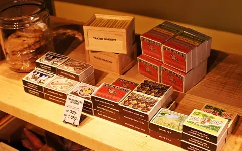 棚に並ぶのはTAKIBI BAKERYのクッキーやさくさくした歯ごたえのラスク、しゃれたマッチ箱風の中身は世界の国をイメージしたお茶が入っていて、パンだけでも購入することができます。