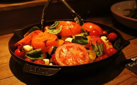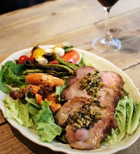 プレートからはみ出さんばかりの赤いデリの皿。使われている野菜の味が濃く、タプラードソース添えのローストポークは柔らかで絶妙な火の入れ加減で絶品、人気のいんげんのオイルソテー、グリルトマトとモッツァレラチーズ、どれもおいしい。