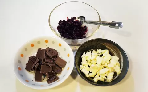 ラズベリーはザルに入れて熱湯を回しかけ、水気をとります。細かく刻んだらラム酒を振りかけて混ぜておきます。チョコレートは割るか刻んでおきます。厚みがある場合は溶けにくいため刻んでおいたほうが失敗しにくくなります。今回はミルクチョコとホワイトチョコを使用していますが、種類は好みでOKです。