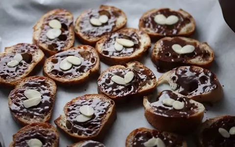 3)天板にオーブンシートを敷き、バゲットを並べ、2のチョコレート液をはけで塗る。全部塗ったらスライスアーモンドをハートの形になるように並べる。
