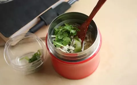 スープジャーに雑穀ご飯を入れ、熱々の煮汁を入れればお昼には美味しい雑炊が出来ています。お昼まで温かい状態にするために、スープジャーは熱湯を入れて温めておき、その中に食材を入れます。