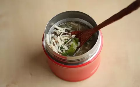 3)スープジャーのお湯を捨て、温めた雑穀ご飯、2のスープ、もずくを入れて蓋をしっかりと閉める。