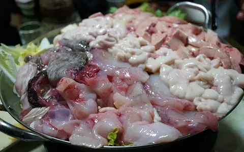 1人前~5人前まで、好きな鍋を組み合わせてオーダーができる。この画像は5人前で、鮟鱇2、あん肝2、白子1という割合になっている。何度か通ううちに極めた黄金比率と言ってもいいかもしれない。