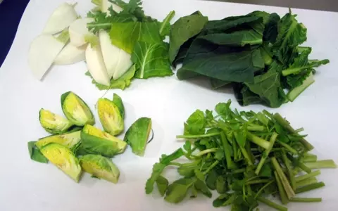 2. 玉ねぎは薄切りにする。かぶは皮をむき8等分に切り、葉もざく切りにする。芽キャベツは4等分に切る。小松菜、セリは根を除き5cmの長さに切る。