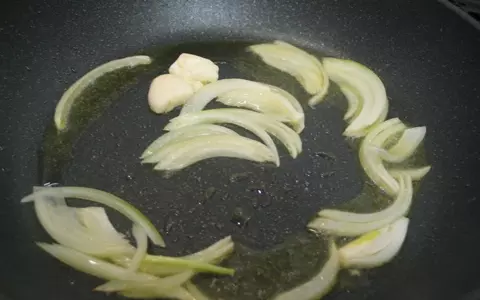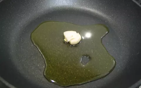 3. にんにくを潰して、オリーブオイルと共にフライパンに入れて熱し、玉ねぎをしんなりするまで炒めて、にんにくは取り出す。