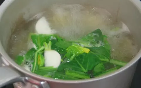 4. 1の茹であがり1分前くらいに、芽キャベツ、かぶ、小松菜の順で入れて共に茹で、茹で汁をお玉1杯分取ってフライパンに加えておき、ザルにあける。セリの半量と共に3へ加えて手早く炒め合わせる。塩、こしょうで味を調え器に盛り、残りのセリをのせる。