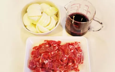 1. 豚肉は細切れや切り落とし等を使います。ロースやモモなど、部位はお好みで。大きい豚肉の場合は食べやすい大きさに切っておきます。赤ワインは甘口でも辛口でもOKですが、新玉葱を使用する場合は甘みが強く出やすいため辛口をお勧めします。玉葱は半分に切り、繊維に沿って5mm~1cmくらいの幅でざっくり切ります。