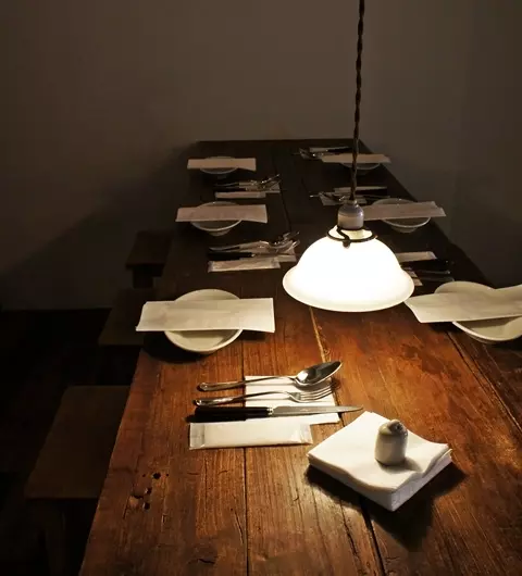 飴色になったイギリスの学校で使われていたアンティークの椅子は背もたれがないので圧迫感もなく、お客さんを迎える準備が整えられたテーブルは美しい規律に満ちています。