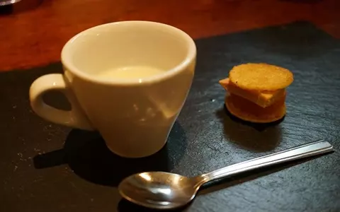 コースのはじまりの合図を告げるアミューズは、「カリフラワーのポタージュとフォアグラサンド」ビスキュイ生地に挟まっているフォアグラは、小さな一口サイズなのに口の中で濃厚な風味が広がる。