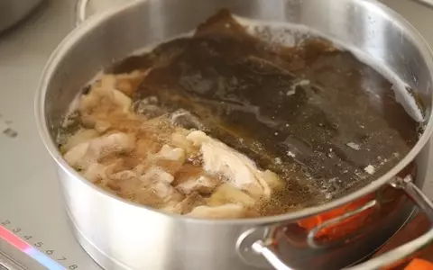 2014年3月2日 12:0030分ほど水に浸けた昆布にそぎ切りにした鶏肉を入れ、中火で煮立たせます。もちろん、豚肉のスライスでも大丈夫です。