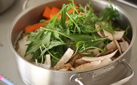 3)1の鍋に鶏肉と酒を入れ、中火にかける。沸騰したらあくを取り、醤油を入れて鶏肉の色が白く変わったら塩で味を調え、野菜を上に乗せ、再び沸騰したら火からおろす。