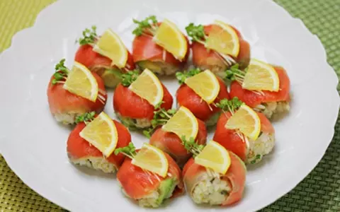 ■サーモンとアボカドの美肌ちらし寿司「サーモンの鮮やかなオレンジ色は、アスタキサンチンというカロテンの色。強い抗酸化作用があり、シミ、シワ、乾燥、肌荒れの予防に役立つ栄養素です。アボカドとゴマには、肌の新陳代謝を活発にしてハリとツヤを与えるビタミンE(別名:若返りのビタミン)がたっぷり。さらにレモンとブロッコリースプラウトに含まれるビタミンCがコラーゲンの生成を助けるため、シミやシワの予防にもいいと言われています。市販の寿司酢は砂糖たっぷりで高カロリーなので、ほんのり甘いりんご酢とレモンで酸味をつけるのもポイントです」
