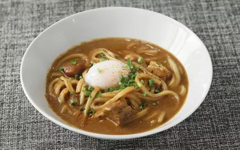 作り方は本当に簡単。まず、カレーをお鍋に入れて温めて、それをめんつゆでのばし、さらに牛乳を加えます。スープが煮えてきたら、讃岐うどんを投入。うどんがほぐれて温まったら、器に入れて小口ねぎと温泉たまごを添えて完成。本当にあっという間にできました。