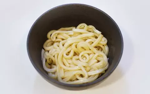 2. うどんを用意します。うどんはお好みのものでOKですが、コシの強い冷凍うどんがこのレシピにはよく合います。冷凍うどんの場合は、ラップをしてレンジで温まるまでよく加熱します。その後、麺つゆをかけてかるく混ぜておきます。