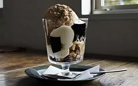 美しい形のガラスの器に入った、コーヒーづくしのパフェ。ぷるんとしたコーヒーゼリーに生クリーム、コーヒーアイスクリーム、コーヒーシリアル、上に乗っているのはダックワーズ。異なるコーヒーの香りと食感が楽しめる、震えるほど素敵なお口直しです。