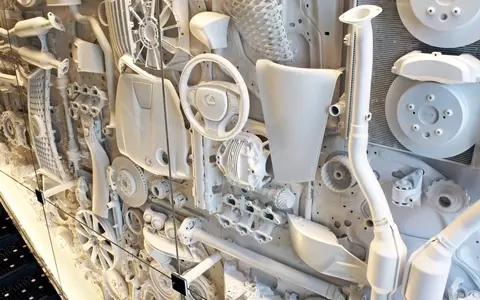 タイヤ痕をイメージした美しい床、2階へ続く階段は手吹き塗装を施した本物のレクサスのパーツが取り付けられ圧倒的な迫力です。