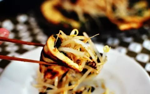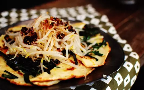 あさりの旨みが詰まった、モチモチのチジミ! もやしのナムルをたっぷり包んで、一緒に食べよう。たっぷりもやしはヘルシーでボリューム満点。これは箸が止まらなくなる美味しさ!