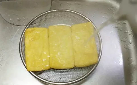 2. 油揚げは熱湯をたっぷり回しかけ、油抜きをします。終わったら、ヘラやお玉などで押さえて水気をよく絞ります。