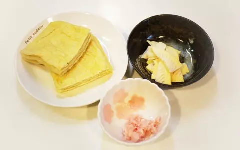 3. 油揚げは二つに切ります。ガリはあれば型抜き等で飾り用に数枚くり抜き、その他はよく刻みます。飾り用の筍は穂先の方を3mmくらいのくし切りにし、他は適当な混ぜやすい大きさに切っておきます。