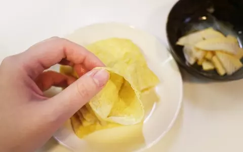 4. 油揚げは煮る前に袋状に中を開いておきます。開きにくい場合は、(梱包材のプチプチを指で潰すような感覚で)油揚げ全体を指先でかるく潰してから開くようにするとやりやすくなります。