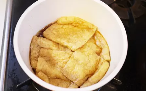 5. 袋ができたら、鍋に水150cc、麺つゆ、砂糖を加えてかるく混ぜ溶かし、油揚げを入れます。蓋をしないで、中弱火でたまに上下を反しながら煮ていきます。煮汁が半分くらいになったら、切った筍を油揚げの下に入れて煮ていきます。煮汁がなくなるまで煮たら火を止めて冷まします。