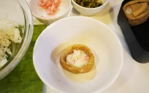 8. 油揚げ→寿司飯→具→寿司飯→具→寿司飯→飾りの具 の順番で中に詰めます。寿司飯に味が付いているので、具は少なめでOKです。最後の寿司飯で具が見えないように綺麗に詰め、飾りの具をのせるようにすると見た目も綺麗に仕上がります。