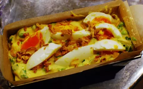 4. オーブンシートを敷いたパウンド型に3を入れ、縦に8等分に切ったゆで卵を埋め込むようにのせ、さらにフライドオニオンを全体に散らして180度に予熱したオーブンで約38~40分焼く。