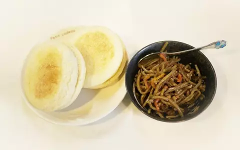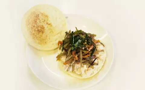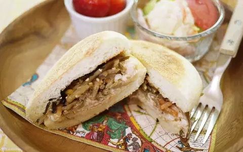 2. 今回使っているパンはイングリッシュマフィンですが、お好みの物でOKです。持ち運びしやすいサンドイッチにして、ランチ用にするのもお勧め。きんぴらごぼうは出来合いのものでもちろんOK。しっかり水気をとっておきます。