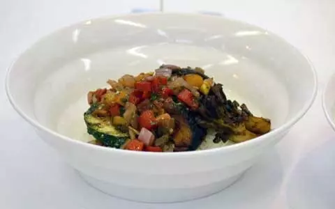 いよいよ試食の時間。カリフォルニアワインで乾杯をした後、「ハーブの香りが豊かな、ナス、ズッキーニときのこのカル・ボウル ローストパプリカのソースで」をいただきます。