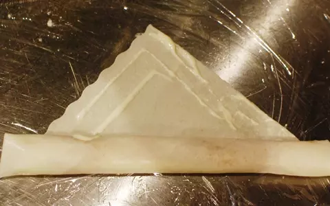 5. 写真のように手前の角で覆い、そこからくるくる巻き、途中で横を織り込み、最後の三角の部分に水溶き小麦粉をつけてしっかりくっつける。