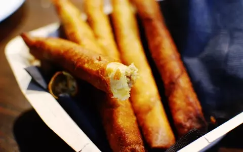 つまんで食べやすいスティックポテトコロッケ。まさにパーチーにぴったりだ。さくさくの春巻きの皮が、まるでパイ生地のよう! 冷めてもおいしいが、熱々はさらにウマイ。熱々が味見できるのは作った人の特権ですぞ。